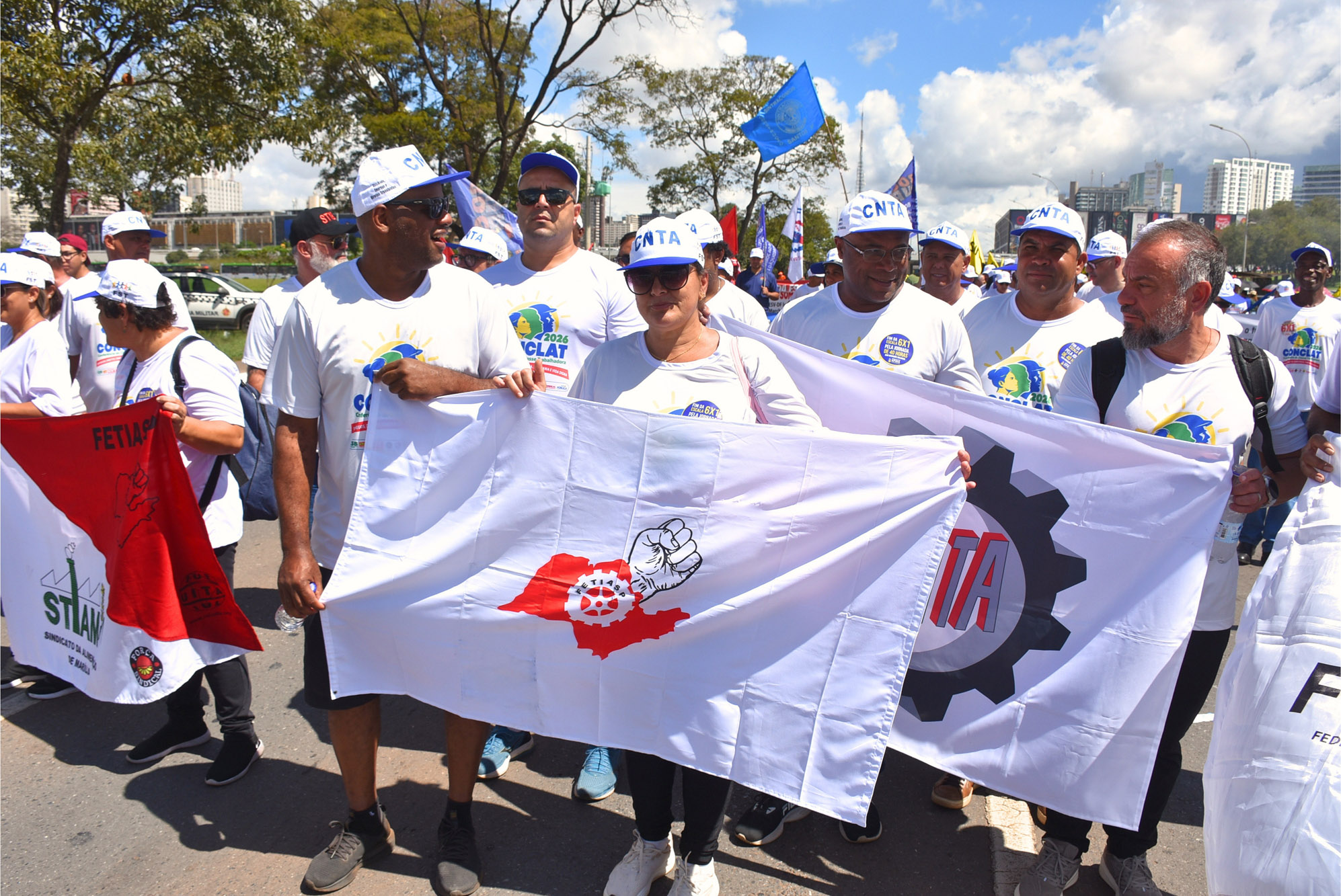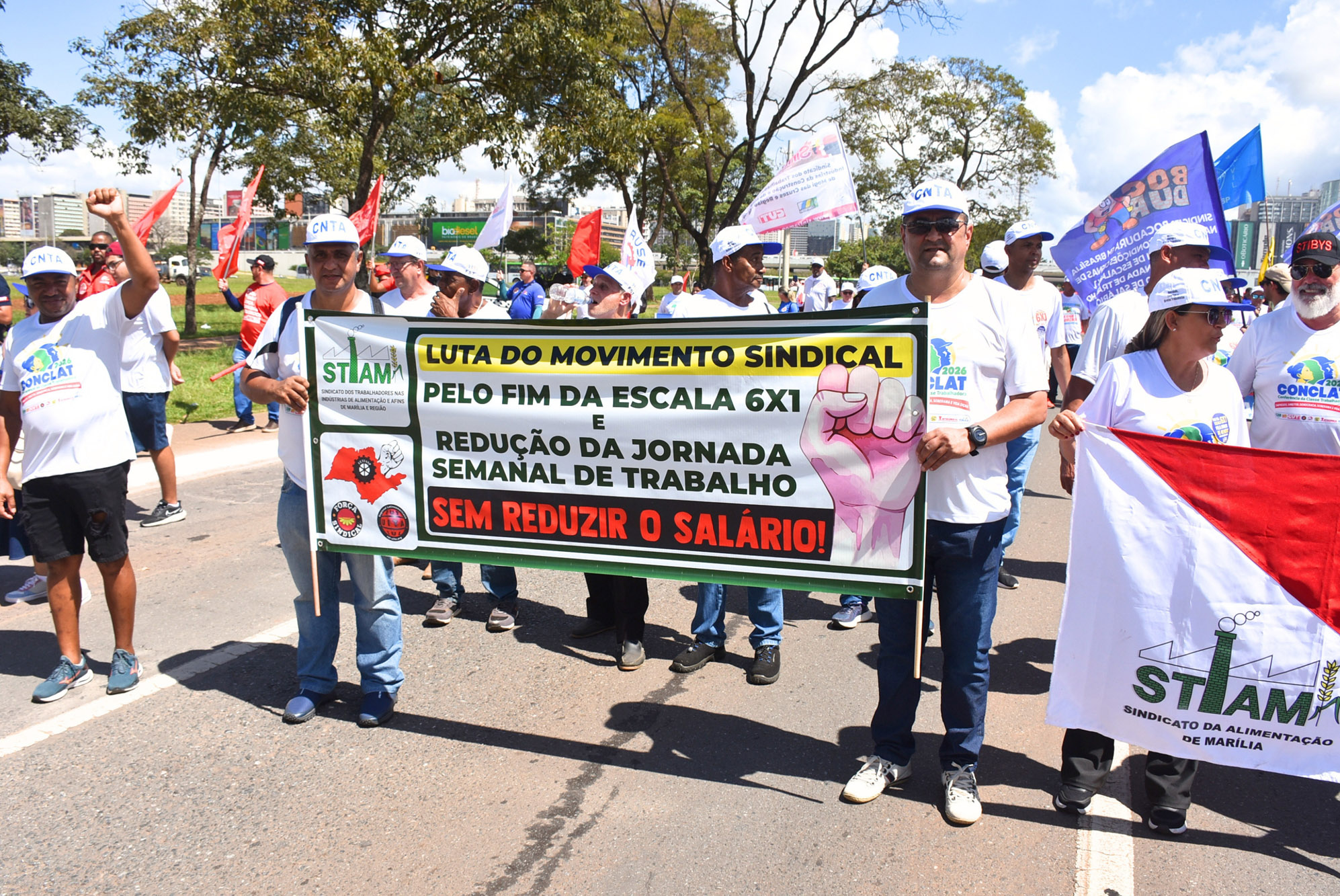 A pauta unificada da classe trabalhadora destacou reivindicações centrais como a redução da jornada sem redução de salários, o fim da escala 6×1, a valorização do salário mínimo, o combate ao feminicídio, a geração de empregos de qualidade, a regulamentação do trabalho por plataformas e o enfrentamento à pejotização.