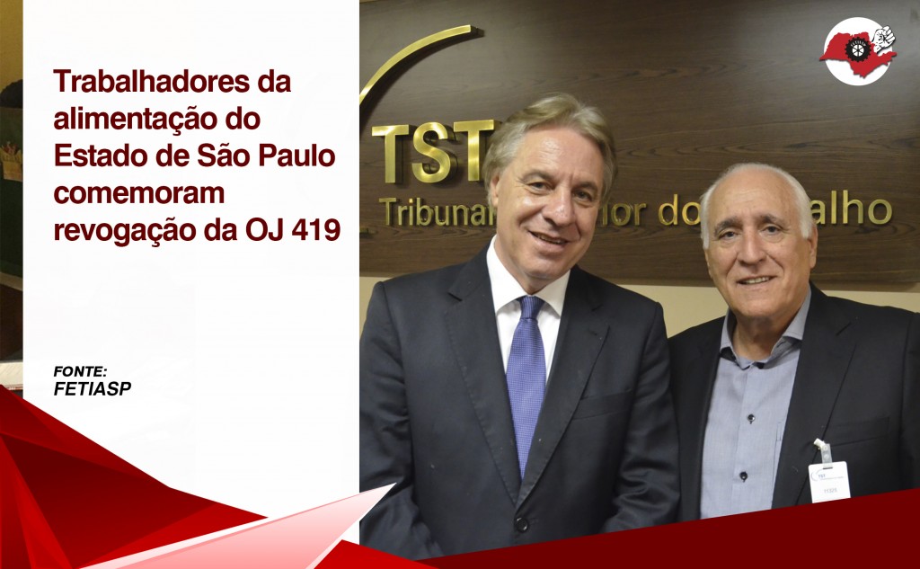 Parabéns Companheiros da Alimentação do Estado de São Paulo principalmente e de todo Brasil, por meio da nossa Federação da Alimentação do Estado de São Paulo e a cada um de seus sindicatos filiados pela Incansável luta de cada um de nós trabalhadores em acabar com a OJ 419 que iria esfacelar os trabalhadores nas indústrias de Alimentação.